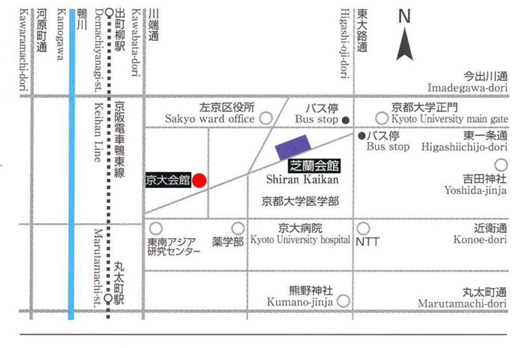 本館(南側:大会会場)と別館(北側:懇親会会場)は道を挟んで真向いにあるにもかかわらず、住所が全く違います。本館は京都大学医学部の一部であって、住所は医学部全体を指しているからです。したがいまして、本館住所を入力してもGoogleナビで会場に到着できません。ナビで会場を探される方は、別館住所を入力して下さい。斜めに走る道路の南西端あるいは北東端にさえ到達すれば、難なく会場は見つかります。